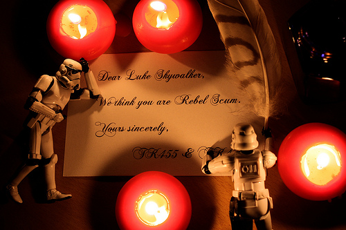 Nothing sets the mood like a nice candlelight letter expressing the hatred. |